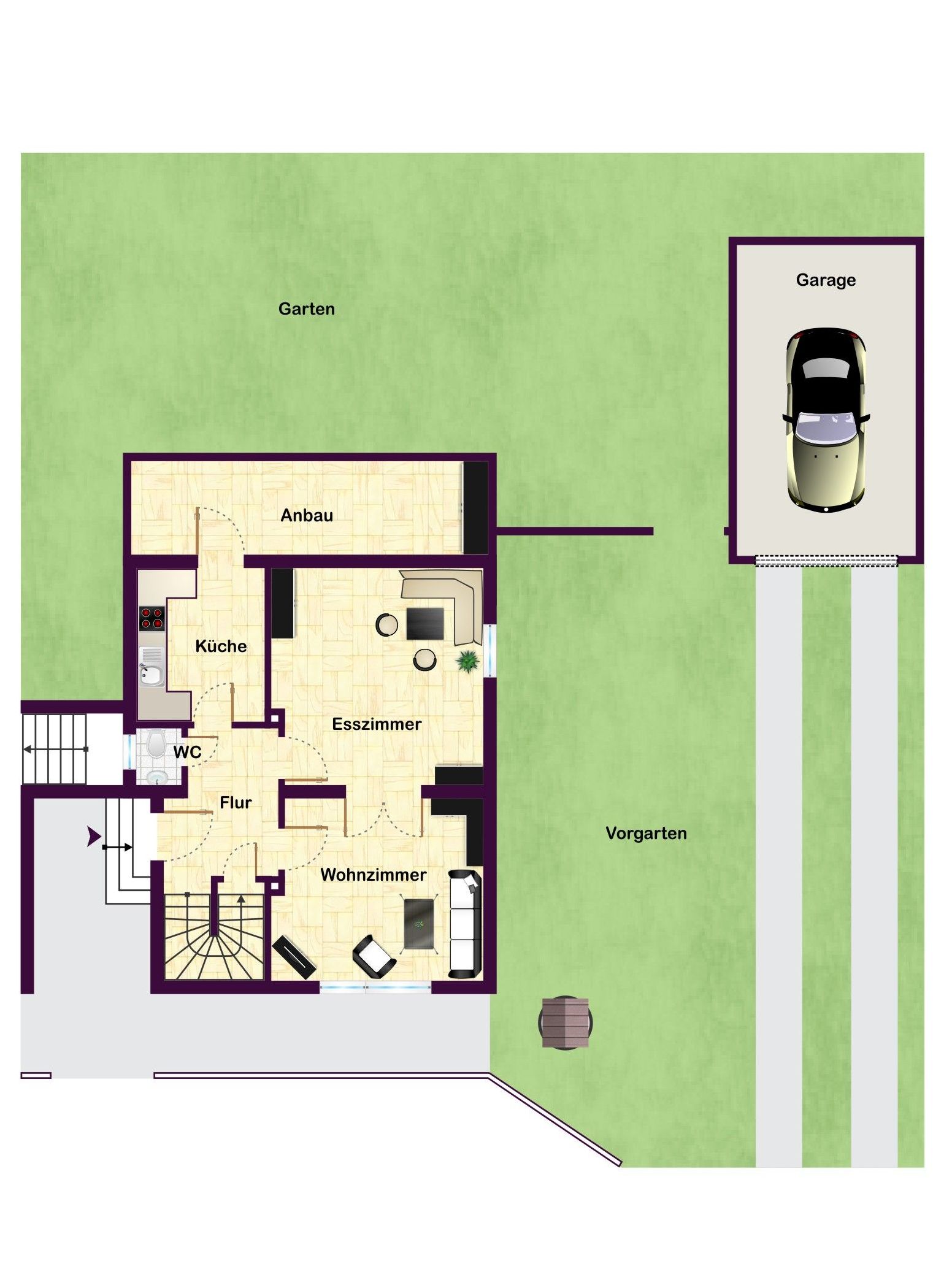 - Wohnfläche ca. 94 m², im EG Wohn- und Esszimmer, Küche, Flur, WC, Anbau als überdachte Terrasse, im OG 2 Schlafzimmer, kleines Bad, kleiner Abstellraum und Flur